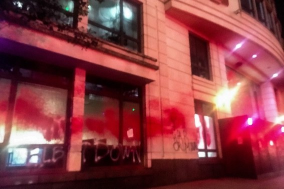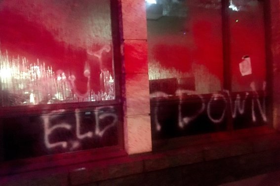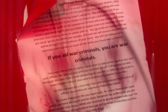 Après un rassemblement en début de semaine à Oldham près de Manchester, pour exiger la fermeture d’Elbit, une usine d’armement israélienne occupée à plusieurs reprises, des militants britanniques ont badigeonné de rouge plusieurs sites d’Elbit, dont son siège, ce vendredi, pour symboliser le sang des Palestiniens.
