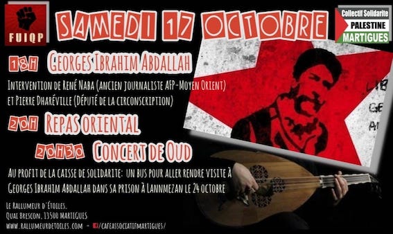 Avant la manifestation de samedi 24 octobre devant la prison de Lannemezan, multiplions les actions de mobilisation et intensifions la pression sur les représentants et les lieux du pouvoir de l’Etat français pour qu’enfin soit signé par le ministre de l’Intérieur actuel l’avis d’expulsion conditionnant la libération de Georges Abdallah !