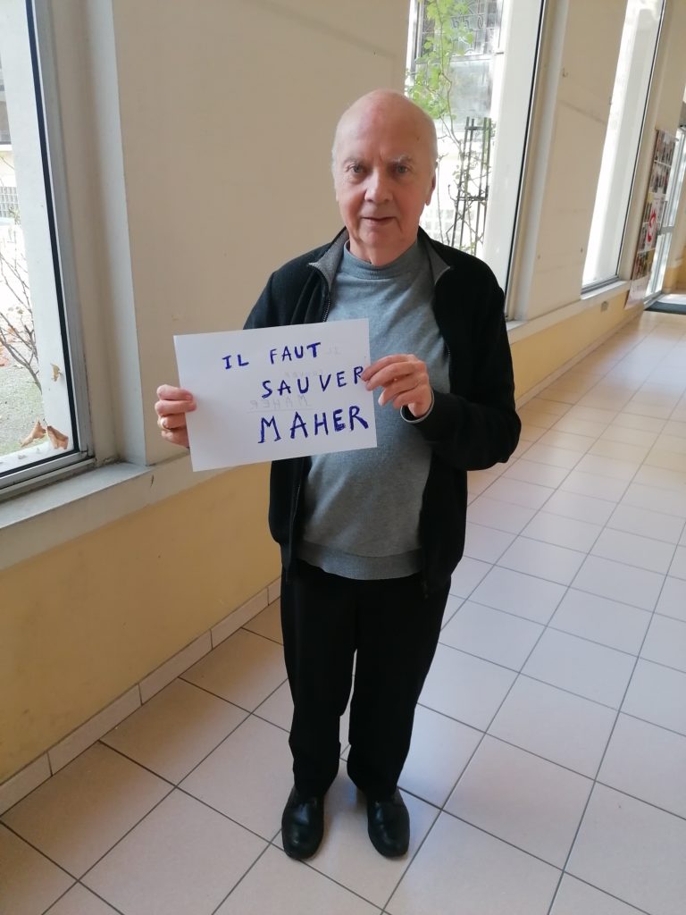 Sous confinement, nous continuons à soutenir Maher, avec sa photo.