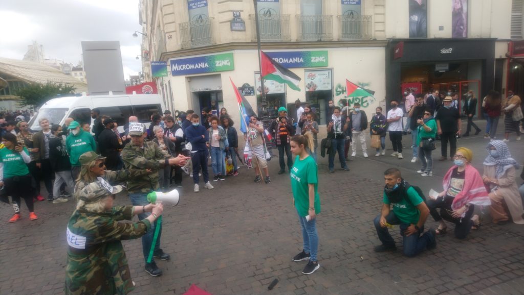 Epargné par la météo, le rassemblement de ce samedi a pu se tenir dans de bonnes conditions à la Fontaine des Innocents, et permettre d’afficher notre soutien à la résistance palestinienne. Plusieurs interventions ont détaillé la situation sur place. Et pour mieux capter l’attention du public, nous avons joué des scènes de checkpoint au milieu des passants.