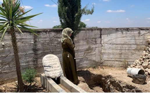 Fatima Hammad prie près de la tombe creusée pour son fils Mohammad à Silwad, en Cisjordanie occupée. Israël a refusé de restituer son corps. (Photo : MEE / Shatha Hammad)