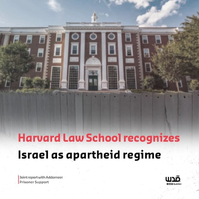 • Dans un rapport conjoint avec l’Addameer Prisoner Support and Human Rights Association, la Harvard Law School, basée à Boston, a reconnu Israël comme un régime d’apartheid, rejoignant une liste d’organisations étiquetant Israël comme tel pour sa pratique de l’apartheid en Palestine occupée. La Harvard Law School, basée à Harvard, a conclu que « les actions d’Israël en Cisjordanie occupée violent l’interdiction de l’apartheid et constituent un crime d’apartheid au regard du droit international ».