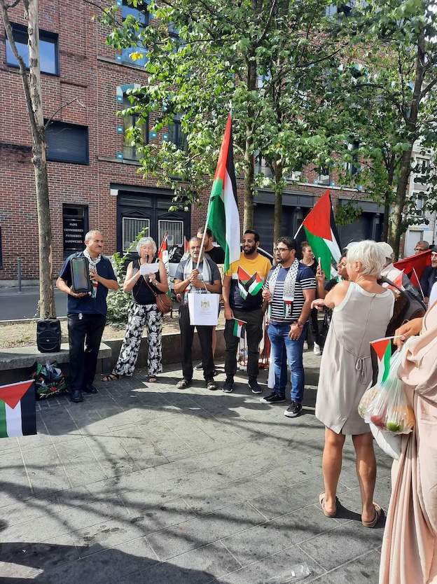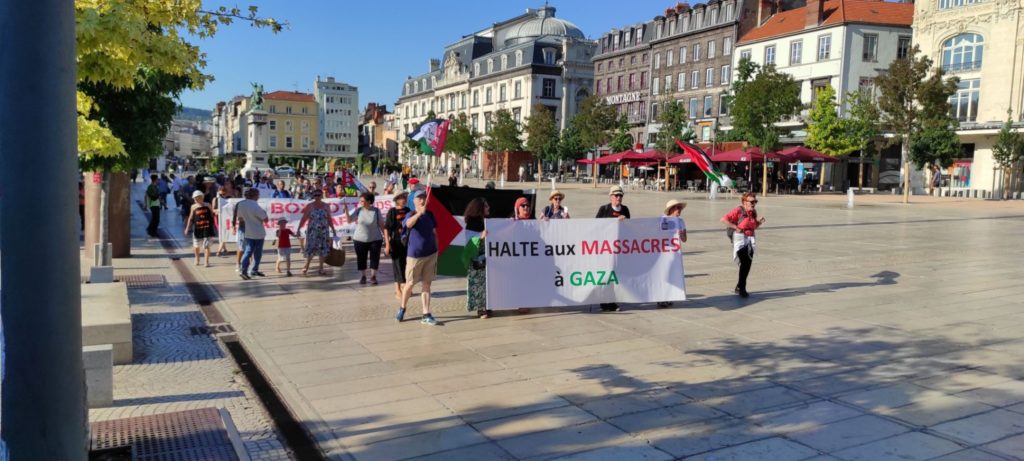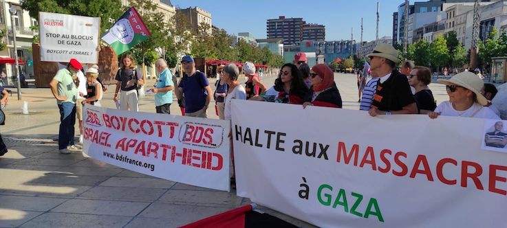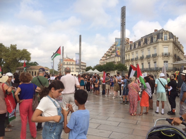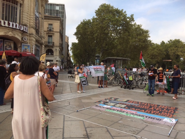 Beau rassemblement unitaire place de la Comédie où les citoyens et les organisations de solidarité avec la Palestine (BDS, UJFP, AFPS, Europalestine) ont pu dénoncer tour à tour les crimes de l’État d’apartheid israélien et appeler au boycott des entreprises compromises dans une collaboration coupable : HP, Puma et Teva en particulier. L’occasion de distribuer une vignette de rappel « pas Teva » à plus d’une centaine de personnes intéressées et motivées.