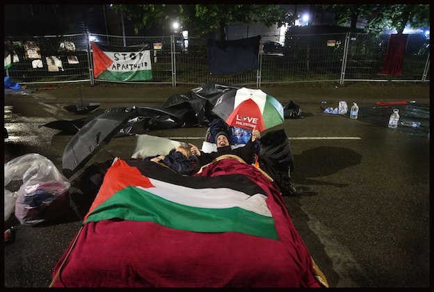 Malgré des pluies torrentielles et l’arrestation de 33 militants de Palestine Action, dont certains responsables du groupe qui ne se trouvaient même pas à Leicester, le moral est au beau fixe, comme le montre cette dabké effectuée samedi sur le lieu du campement.
