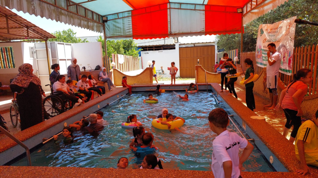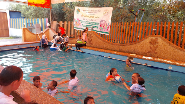 Activités de toutes sortes, piscine, parc d’attractions, maths en s’amusant, chansons, dabke, et toutes sortes de jeux collectifs qui ont permis à 60 filles et garçons de sortir de leur isolement dans la bande de Gaza assiégée depuis leur naissance.