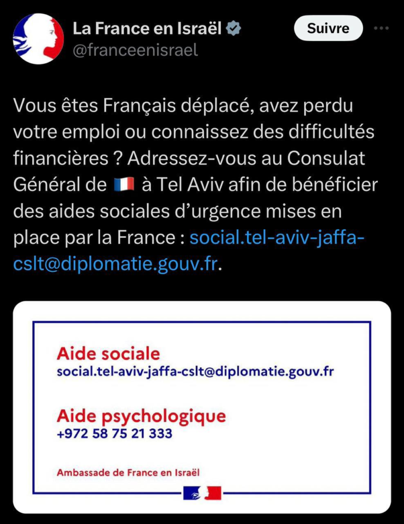 La France va accorder des aides sociales aux binationaux franco-israéliens en difficulté financières en Israël.