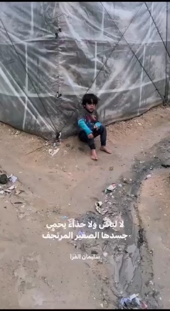 Une petite assise à l’extérieur de la tente de sa famille dans l’un des camps de personnes déplacées de Deir Al Balah répond quand on l’interroge : « J’ai perdu mes chaussures dans le bombardement de ma maison » alors qu’elle a perdu également des membres de sa famille