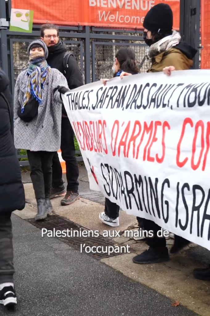 Des manifestants ont bloqué mercredi l accès au salon professionnel « Paris Space Week » où étaient présentes les entreprises Dassault et Airbus, afin de dénoncer la vente d’armes et de composants d’armement à Israël.