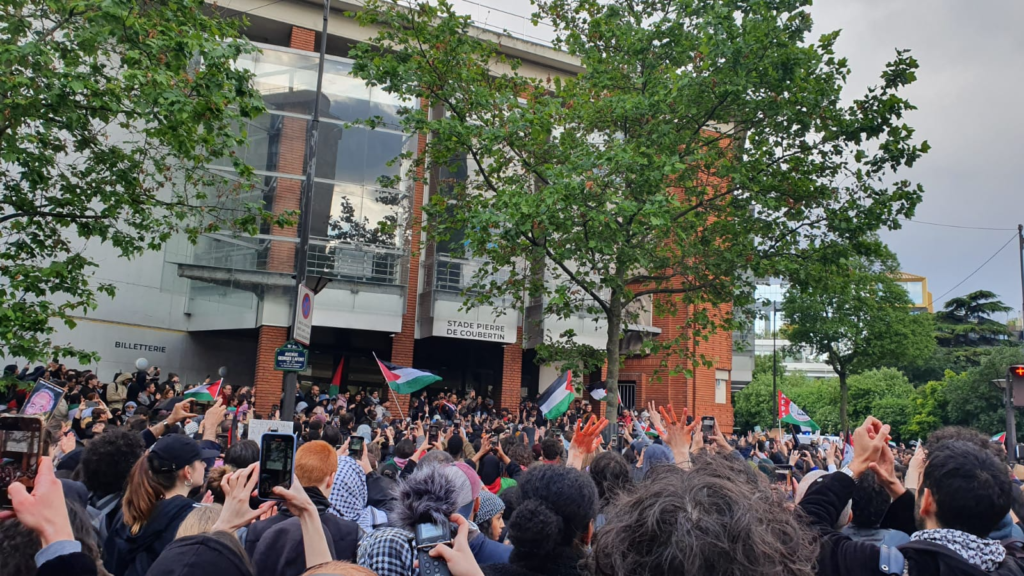 Après un blocage du périphérique par les manifestants pour contourner une présence massive de policiers, arrêt devant le stade Pierre Coubertin, à côté de la Tour, où les forces de « l’ordre » ont empêché la manifestation d’aller plus loin.