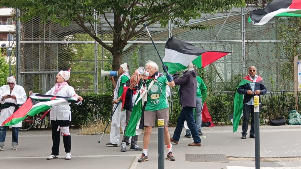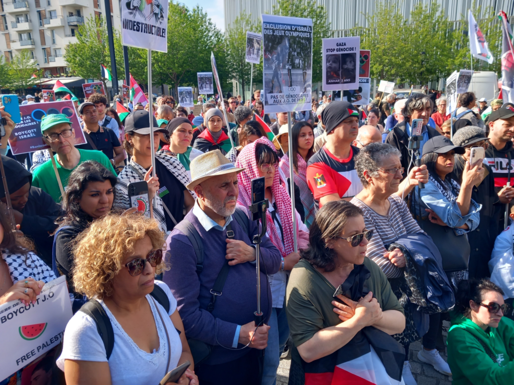 Nous manifestons à présent tous les jours devant le siège du Comité d’Organisation des Jeux Olympiques (COJO), sur l’esplanade à la sortie du Métro Front Populaire (ligne 12), pour protester contre la collaboration de cet organisme avec l’État génocidaire israélien.