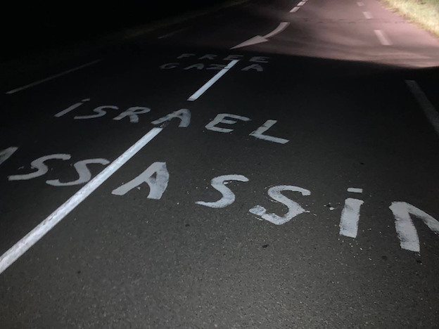 Tour de France : cette nuit des militants ont peint des inscriptions sur le trajet des cyclistes pour dénoncer la présence de l’équipe « Israël Premier Tech ».