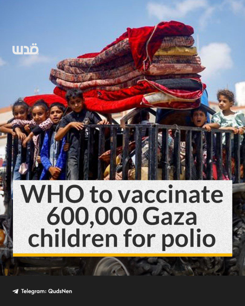 Tedros Adhanom Ghebreyesus, le secrétaire général de l’Organisation mondiale de la santé (OMS), a annoncé que son agence enverrait plus d’un million de vaccins contre la polio à la bande de Gaza. Ces vaccins seront administrés dans les semaines à venir à quelque 600 000 enfants de moins de huit ans.