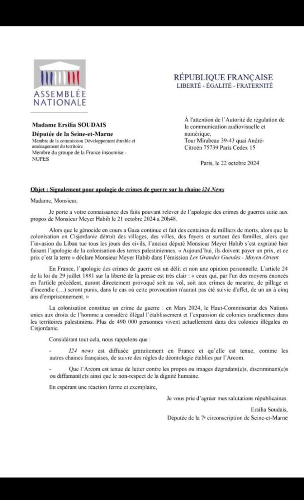 La députée Ersilia Soudais (LFI, La France Insoumise) a dénoncé mardi l’ex-député Meyer Habib, ainsi que la chaîne sioniste I24 News, pour apologie de crime de guerre.