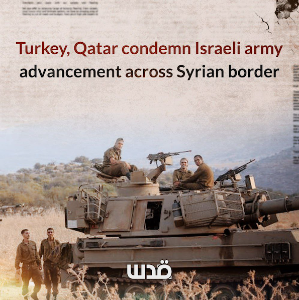 Déclaration du ministère des Affaires étrangères du Qatar : « Il est inacceptable qu’Israël exploite la situation actuelle en Syrie et viole sa souveraineté. » « Nous condamnons la violation et la saisie de la zone tampon par l’occupation israélienne avec la Syrie. » « Notre message à tous les Syriens est que la souveraineté et l’intégrité territoriale de la Syrie sont désormais la priorité. »