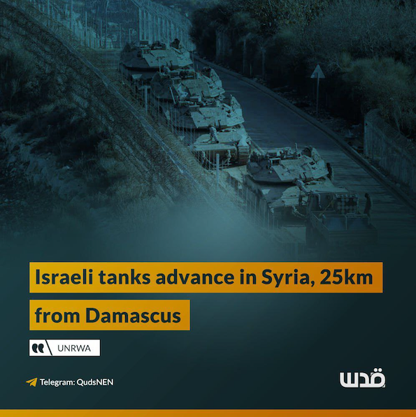 « Les forces israéliennes frappent les faubourgs de Damas alors que le chaos s’empare de la Syrie », rapporte Reuters, citant des sources de sécurité. L’armée israélienne a avancé d’environ 25 kilomètres au sud-ouest de la capitale syrienne de Damas. « , affirme-t-on de même source.