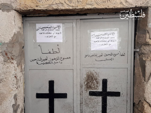 L’église de Porphyre à Gaza a affiché aujourd’hui un panneau indiquant « Entrée interdite aux personnes non déplacées », fermant ses portes aux célébrations.
