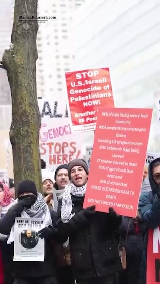 Des militants manifestent devant un hôpital de New York pour exiger la libération du Dr Hussam Abu Safiya, directeur de l’hôpital Kamal Adwan de Gaza, emprisonné par Israël.