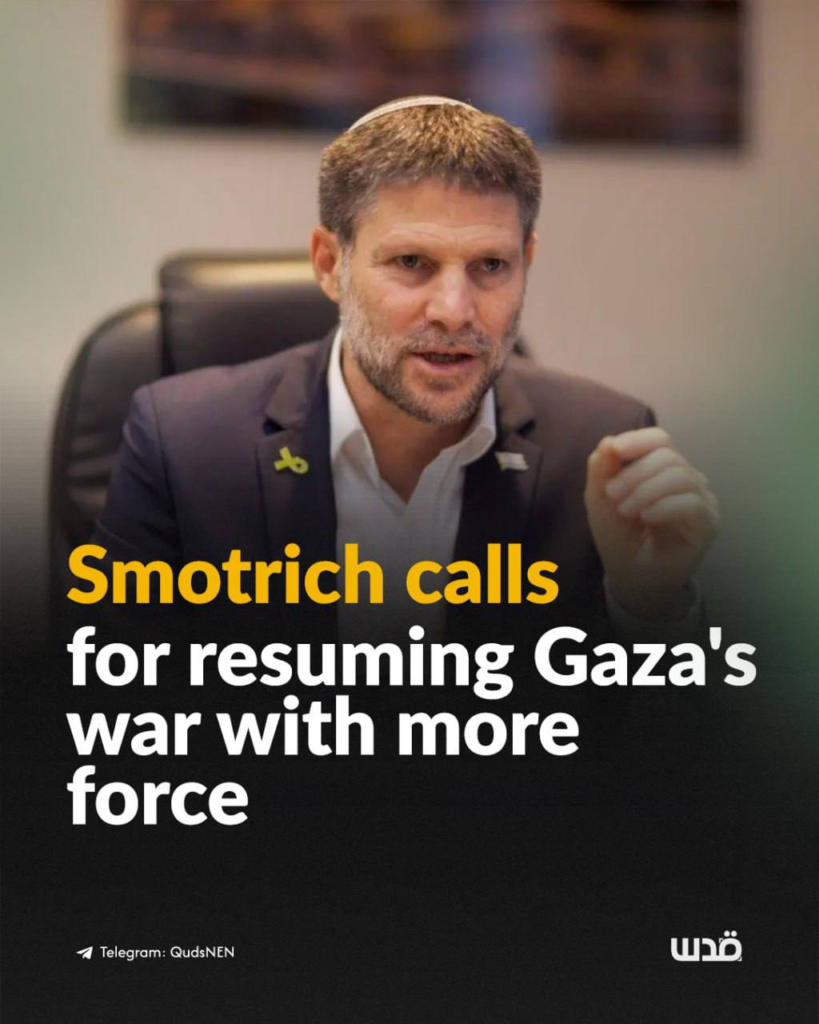 Le ministre israélien des Finances, Bezalel Smotrich, a publié une déclaration vidéo sur les réseaux sociaux dans laquelle il déclare avoir posé des conditions pour accepter l’accord de cessez-le-feu avec la résistance palestinienne dans la bande de Gaza. Il a exigé que l’armée israélienne reprenne les combats après la libération des prisonniers israéliens, réduise l’aide humanitaire, contrôle la bande de Gaza pour toujours et encourage l’émigration des habitants de Gaza.