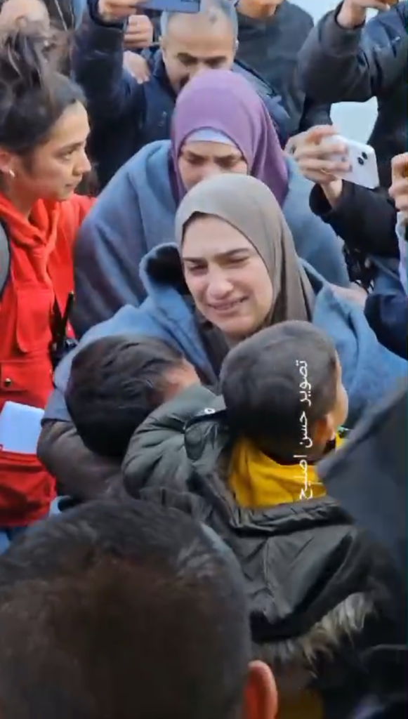 Cette mère de famille Asmaa Shatat, kidnappée sans la moindre raison par l’armée israélienne dans la bande de Gaza durant le génocide, retrouve enfin ses enfants ce jeudi, Israël ayant finalement libérés 46 gemmes et adolescents après les autres otages palestiniens.