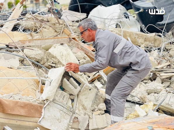 Des Palestiniens inspectent les dégâts après la démolition de leurs maisons par les forces d’occupation dans le quartier de Naplouse Al-Jadida :