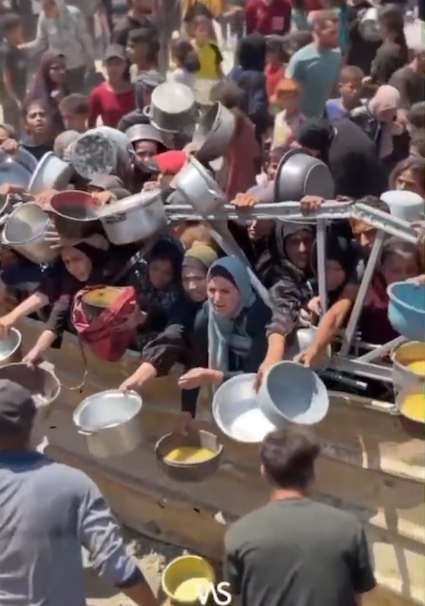 Des Palestiniens se rassemblent dans une cuisine caritative à Gaza, au milieu de la guerre de famine et du génocide menés par Israël dans la bande de Gaza.