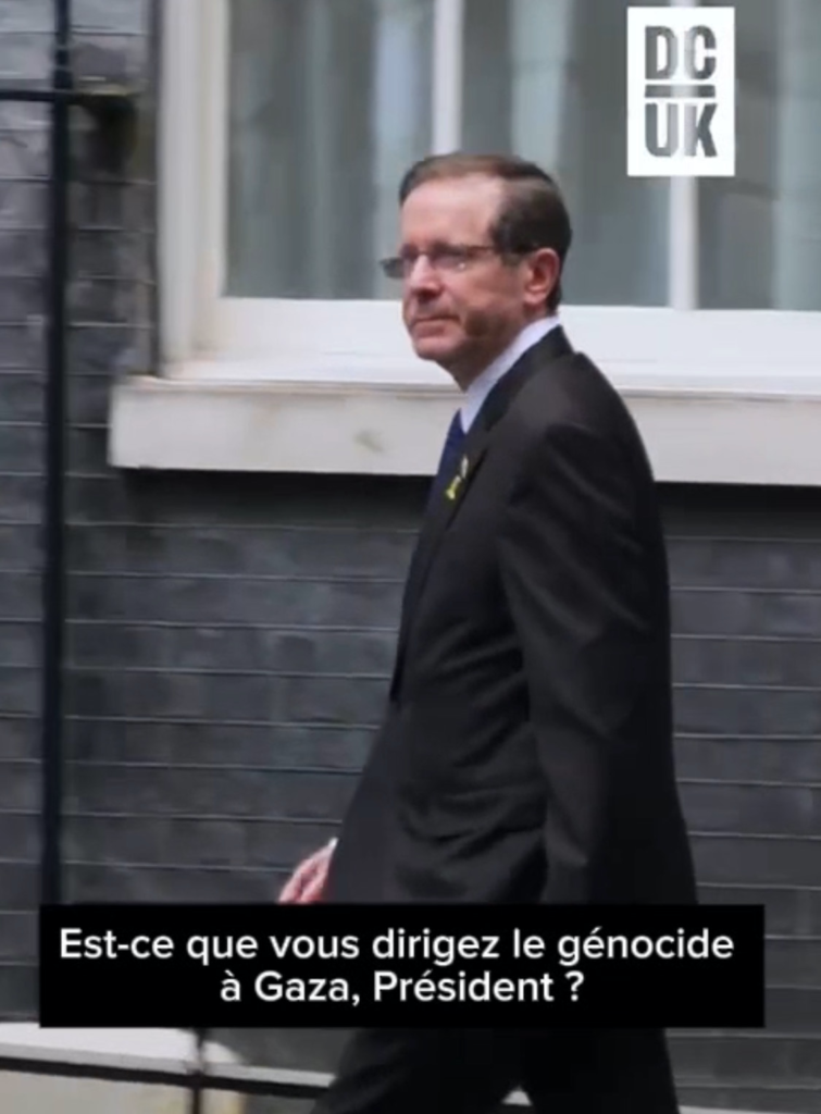 Un journaliste de « Declassified UK » confronte le président israélien Isaac Herzog à Downing Street, et lui demande s’il est un criminel de guerre, alors qu’il se rend à une réunion avec le Premier ministre britannique Keir Starmer.