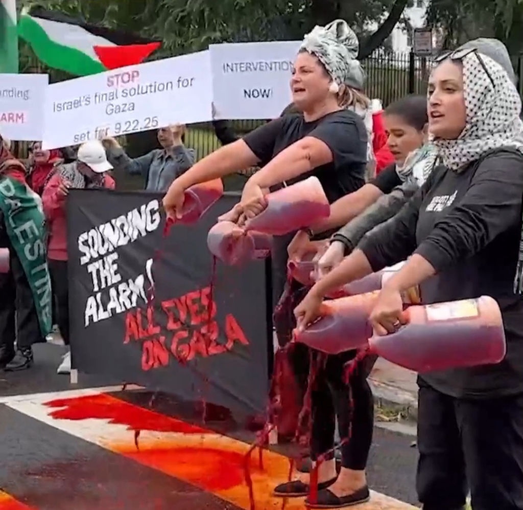 Un groupe de manifestants s’est rassemblé près de l’ambassade britannique à Washington DC, aux États-Unis, et y ont versé un colorant de couleur rouge sur la ligne de passage symbolisant les attaques israéliennes contre les Palestiniens à Gaza