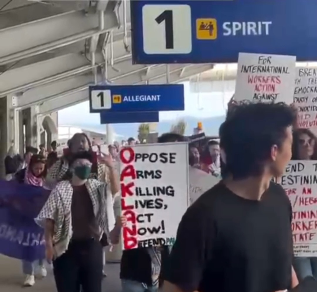 Manifestation dans l’aéroport international d’Oakland pour exiger la fin des livraisons d’armes américaines à Israël.