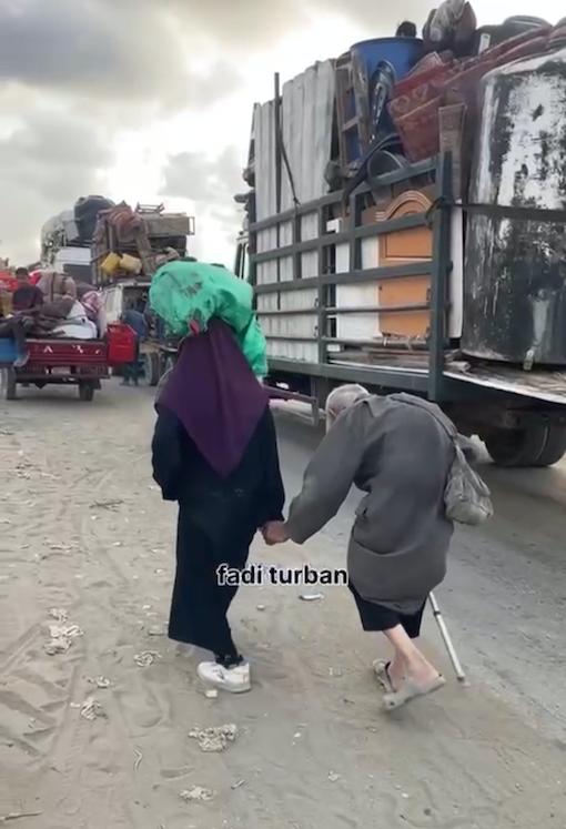 Au milieu de l’assaut intensifié d’Israël sur la ville de Gaza, une femme palestinienne âgée en train de marcher main dans la main avec son mari, refusant de le lâcher, comme s’il était sa dernière ancre d’espoir dans un monde en train de s’effondrer.