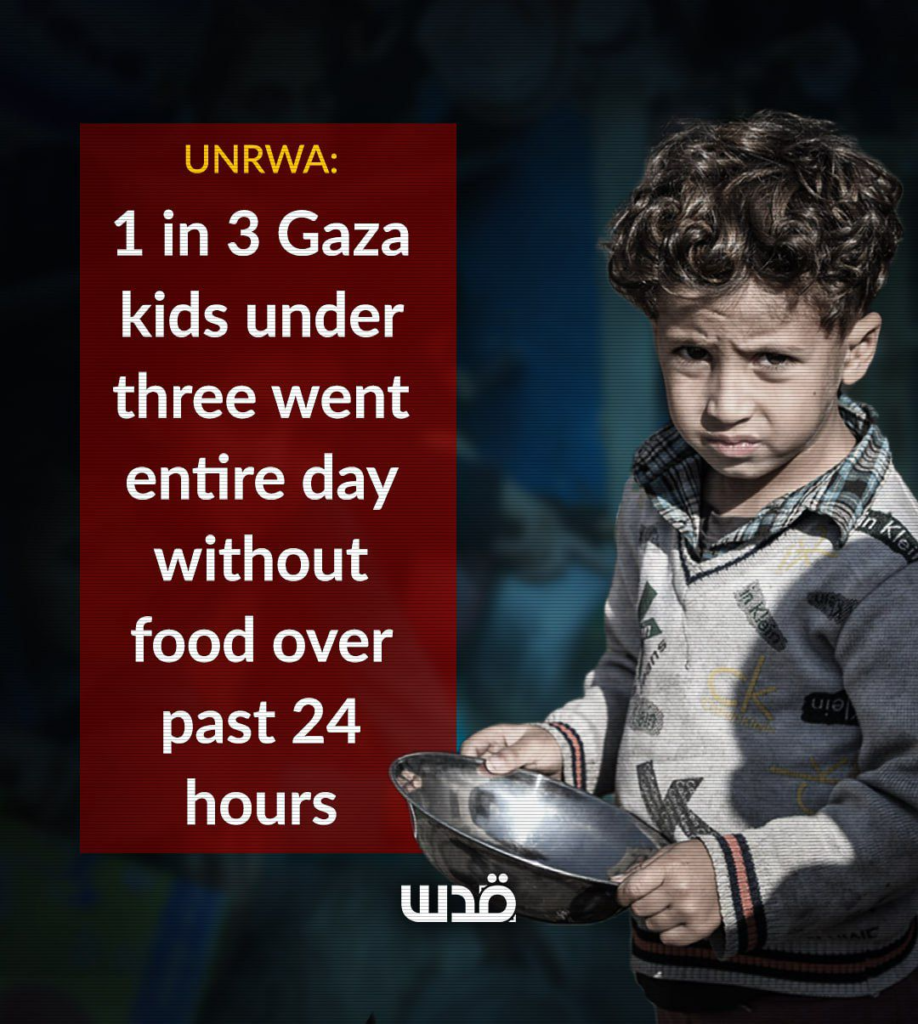 L’UNRWA indique que, selon une évaluation rapide des besoins à Gaza réalisée par l’IRC, un jeune enfant sur trois passe une journée entière sans manger au cours des dernières 24 heures.