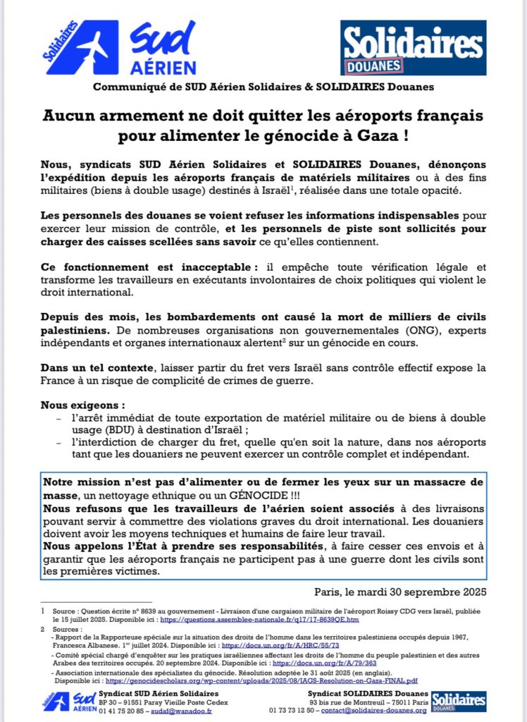 La CGT de l’aéroport Roissy-CDG et le syndicat SUD Douaniers alertent sur le maintien, dans des conditions de totale illégalité, de matériels destinés à l’entreprise génocidaire israélienne Elbit.