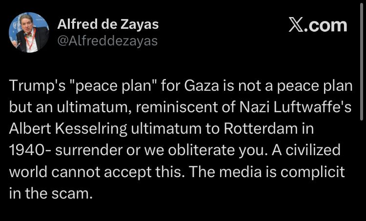 Alfred de Zayas, premier expert indépendant des Nations Unies sur la promotion d’un ordre international démocratique et équitable, commente le plan de Trump pour Gaza en le comparant à l’ultimatum adressé à Rotterdam en 1940 par le patron de l’armée de l’air nazie, Albert Kesselring.