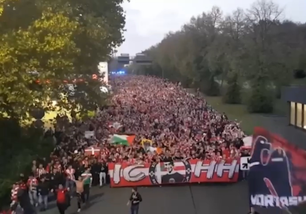 Des centaines de supporters de l’Athletic Bilbao se sont rassemblés pour la Palestine avant leur match de Ligue des champions contre le Borussia Dortmund, à Dortmund, en Allemagne.