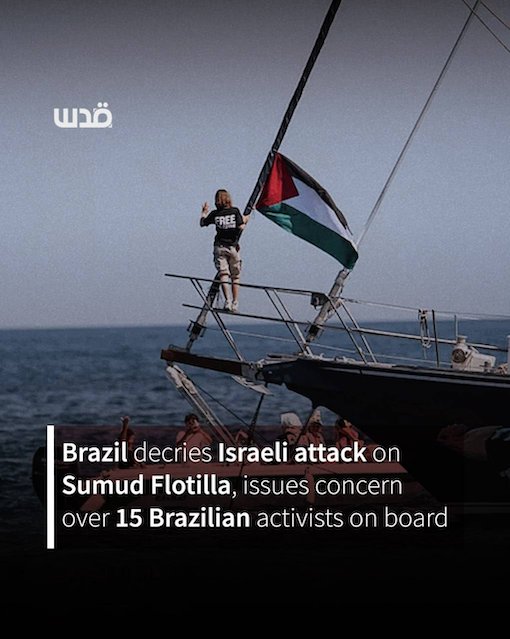 Le Brésil a condamné l’interception par la marine israélienne de la flottille Sumud transportant de l’aide à Gaza, et exprimé t ses inquiétudesconcernant la sécurité des 15 ressortissants brésiliens participant à la mission, dont une députée et députée brésilienne Luiza Erundina.