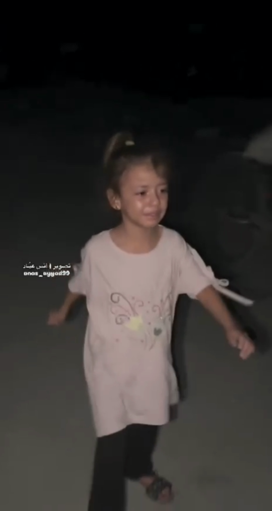 Une petite fille palestinienne pleure alors qu’elle marche dans les rues de la ville de Gaza à minuit, n’ayant aucun endroit sûr où aller, forcée de quitter sa maison alors que les bombardements israéliens s’intensifient.