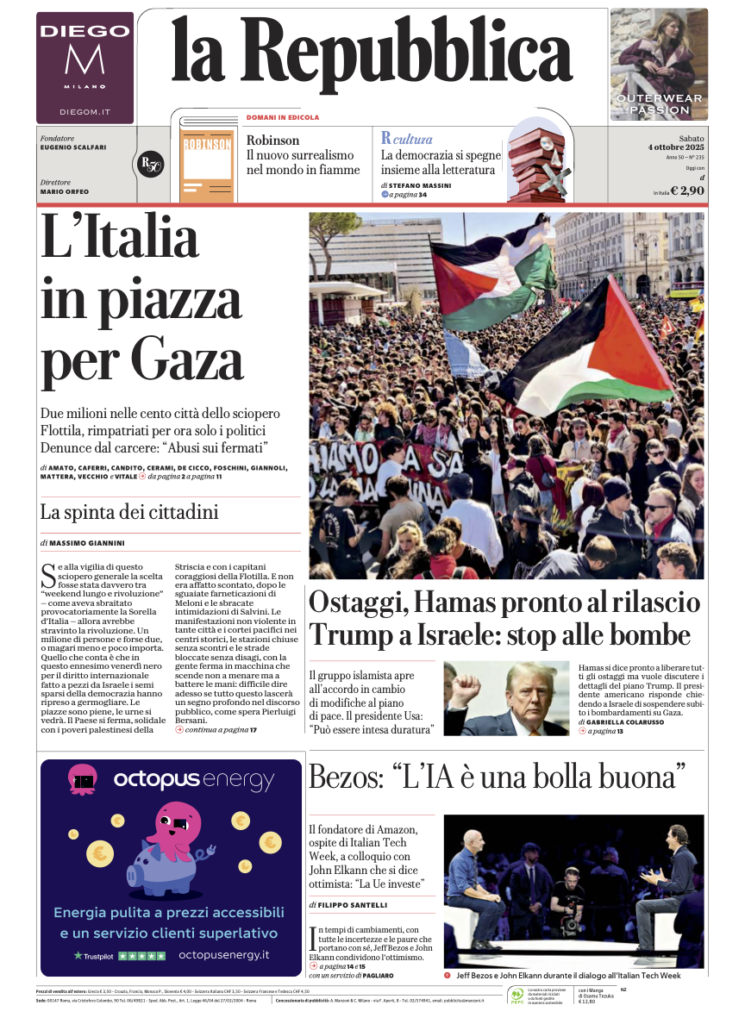 5 octobre 2025ACTUALITÉS URL has been copied successfully! URL has been copied successfully!Partagez: La « UNE » du quotidien italien le plus lu, la Repubblica : QUELQUES IMAGES DE ROME : CAPJPO-Europalestine Article en PDF Partagez: