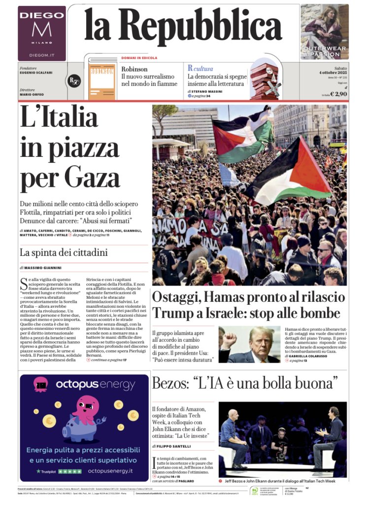 La « UNE » du quotidien italien le plus lu, la Repubblica :