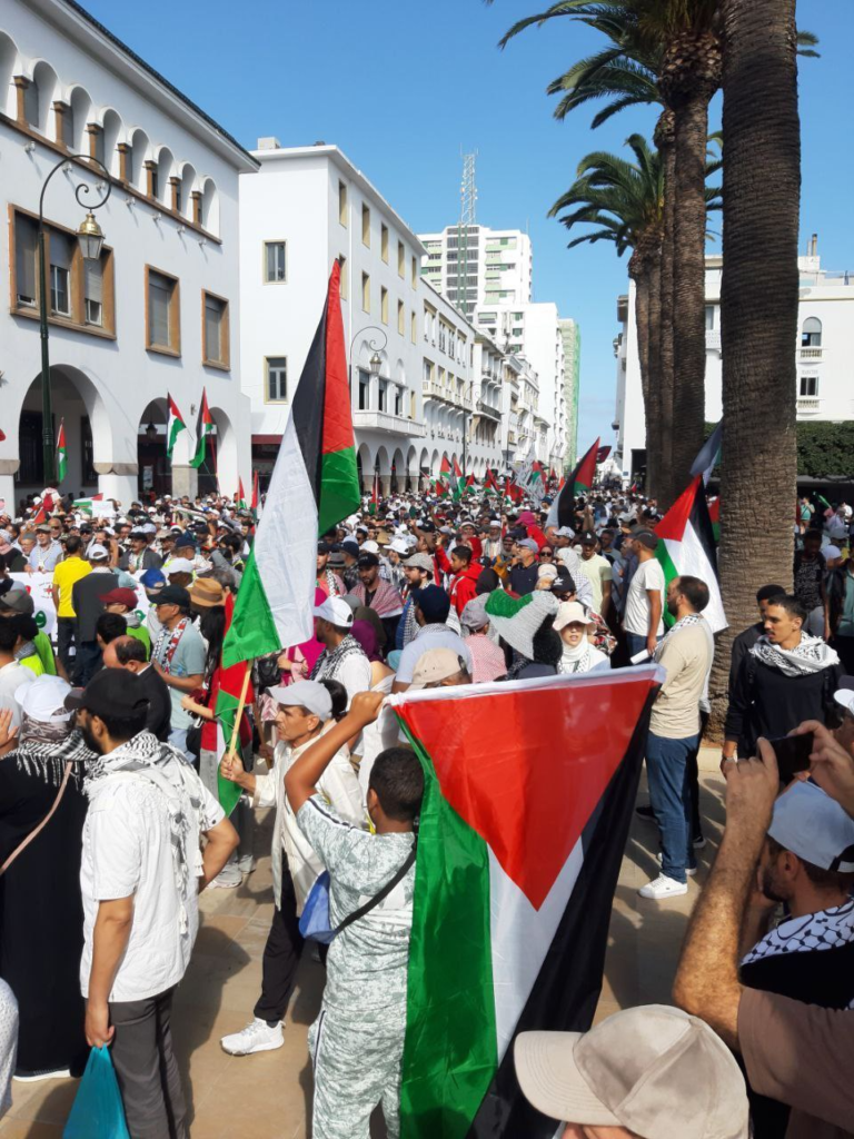 Une puissante manifestation de solidarité avec Gaza s’est également déroulée au Complexe sportif Mohammed V. à Casablanca au Maroc, lors du match Raja Casablanca/Maghreb Fès