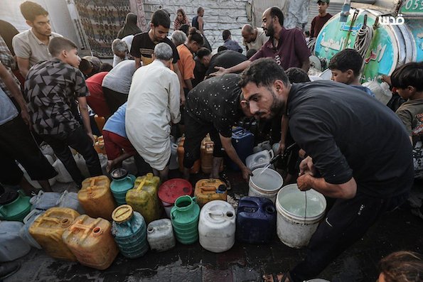 Dans le camp de réfugiés d’Al-Bureij, au centre de Gaza, les habitants font la queue autour de réservoirs d’eau mobiles pour s’approvisionner en eau potable, alors que l’agression israélienne se poursuit.