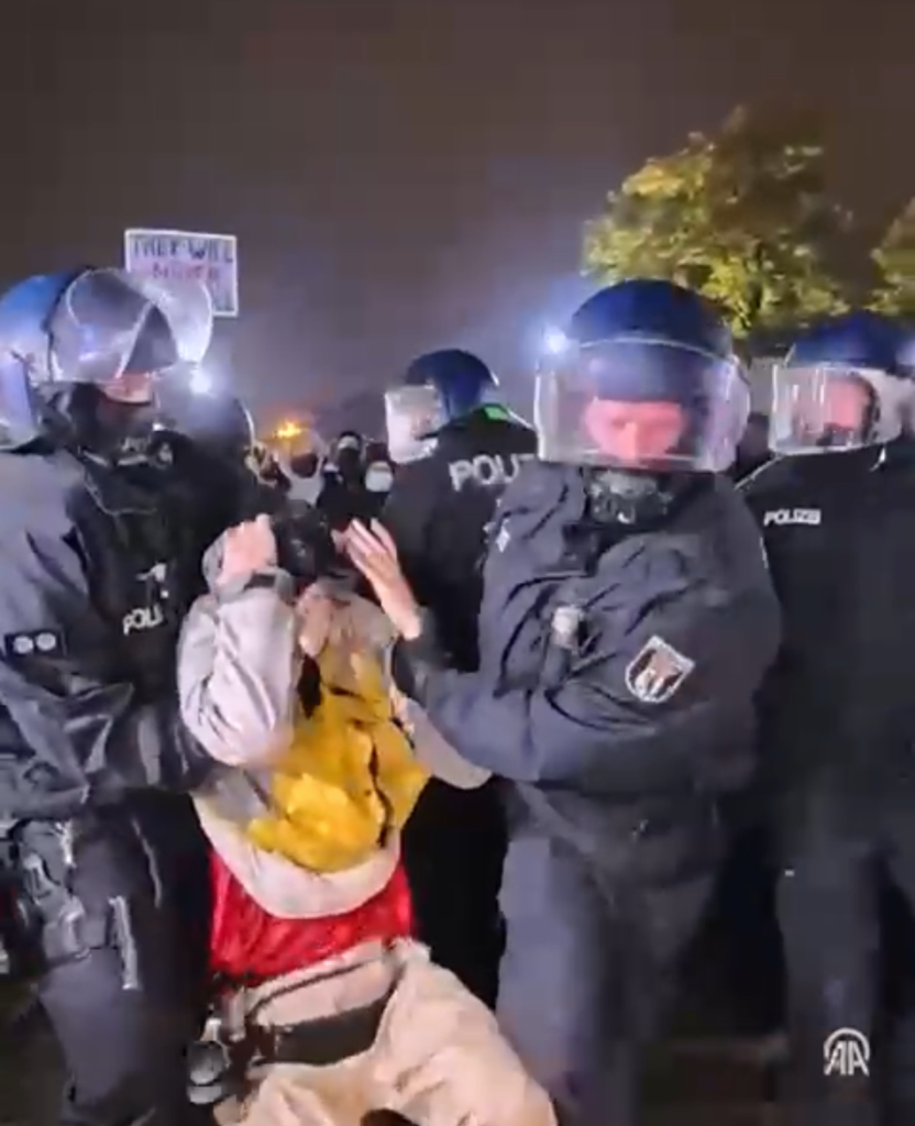 Regardez comment la police allemande, si brutale avec les manifestants contre le génocide, entoure et protège une contre-manifestante avec son drapeau israélien !