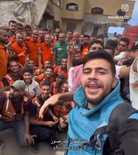 Les journalistes et les équipes de la défense civile (secouristes) célèbrent le cessez-le-feu à Gaza