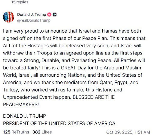 Trump qui aspire à recevoir le prix Nobel de la paix et est engagé dans une course contre la montre puisque la nomination doit être annoncée vendredi, s’est déclaré « fier qu’Israël et le Hamas aient signé la première phase du plan de paix ».