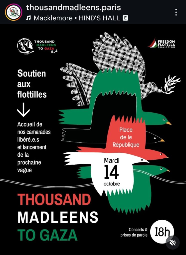 C’est avec Macklemore et Hind’s Hall que nous accueillerons à Paris, mardi soir à partir de 18 H, les militants de la Flottille Thousand Madleens.
