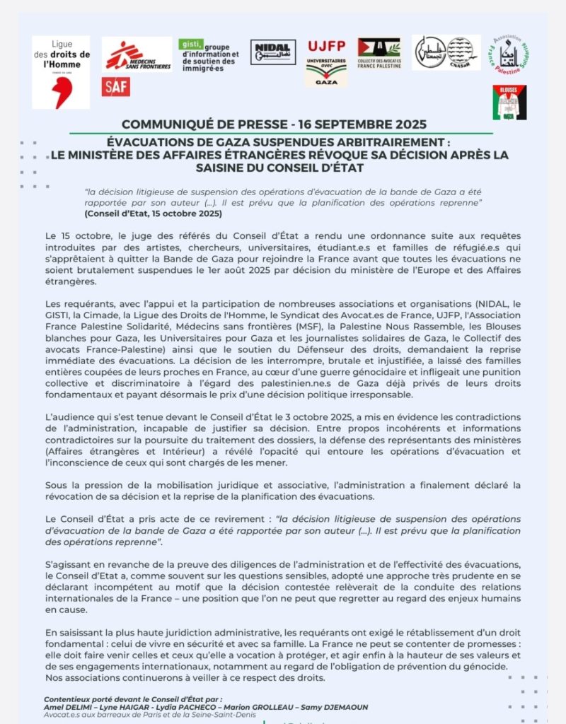 Attaqué en justice par une série d’associations pour sa scandaleuse interruption des évacuations de familles désunies et blessés palestiniens de la bande de Gaza, le gouvernement français a « révoqué » sa propre mesure, sans garantie qu’il s’y conformera concrètement.