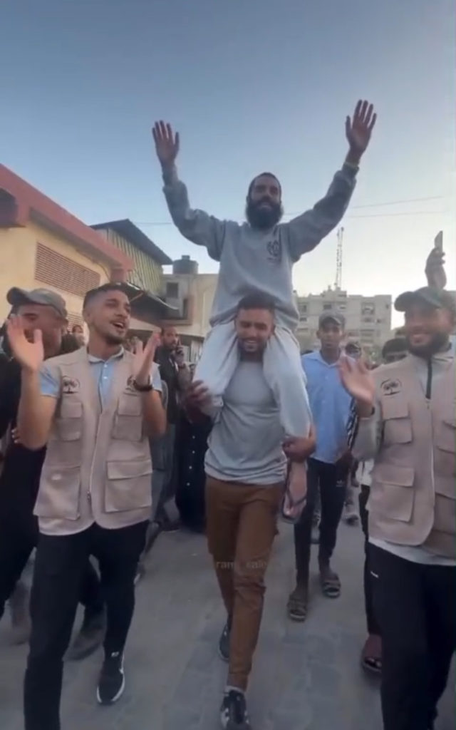 Un Palestinien célèbre sa libération de l’emprisonnement israélien après avoir été enlevé par les forces d’occupation pendant le génocide.