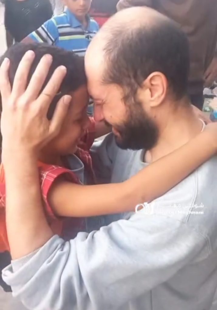 L’infirmier Mohammed Al-Azbat, libéré de Gaza, embrasse son enfant après avoir été libéré des prisons israéliennes, après deux ans de détention dans le cadre de l’accord d’échange de prisonniers.