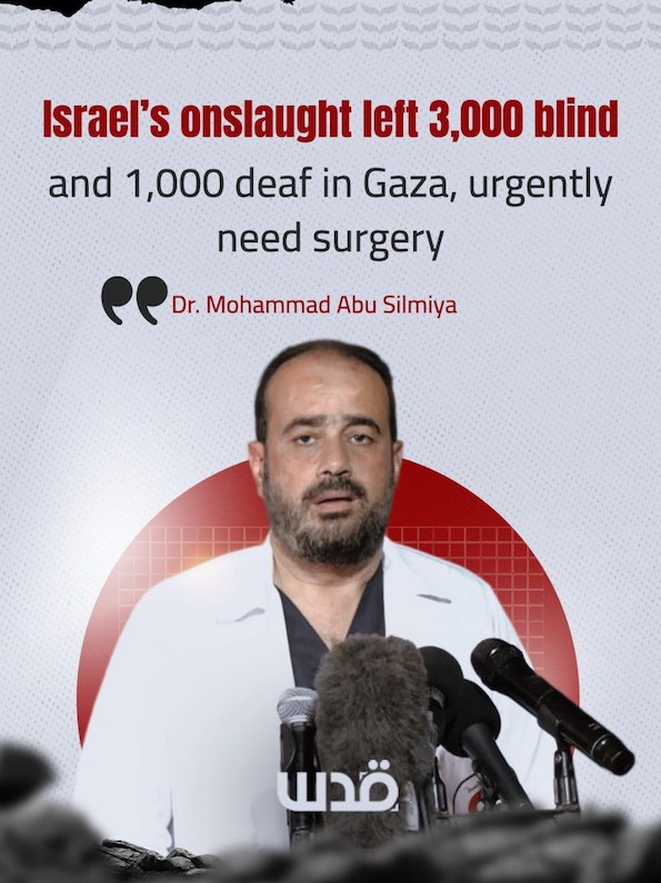 L’attaque génocidaire israélienne contre Gaza, qui a duré plus de 2 ans, a laissé 3 000 personnes aveugles et 1 000 sourdes sur le territoire, dont beaucoup ont besoin d’une intervention chirurgicale urgente, selon le Dr Mohammad Abu Silmiya, directeur du complexe médical Al-Shifa à Gaza.