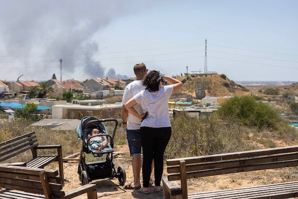 Des Israéliens observent la fumée s’élevant au-dessus de Gaza suite aux frappes aériennes israéliennes, lors d’une manifestation appelant au rétablissement des colonies juives dans la bande de Gaza, le 14 mai 2024. (Oren Ziv)