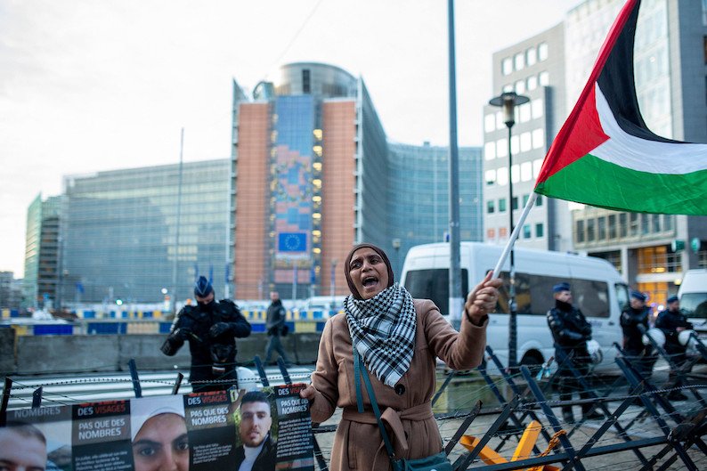Une manifestante brandit un drapeau palestinien lors d’une manifestation pour un cessez-le-feu permanent à Gaza devant les bureaux de l’UE à Bruxelles, en Belgique, le 1er février 2024. (Anne Paq/Activestills)