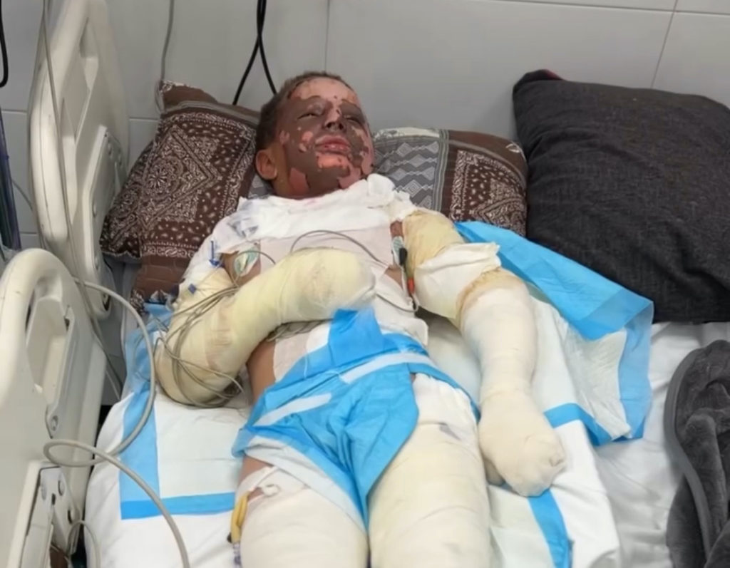Majd Abu Habib, un petit Palestinien de 11 ans, originaire de Khan Younès, vient de subir de graves brûlures sur 35 % du corps après l’explosion d’un reste de munitions de l’armée israélienne.